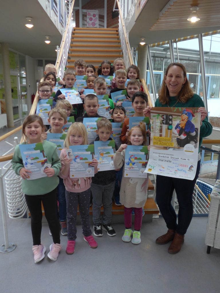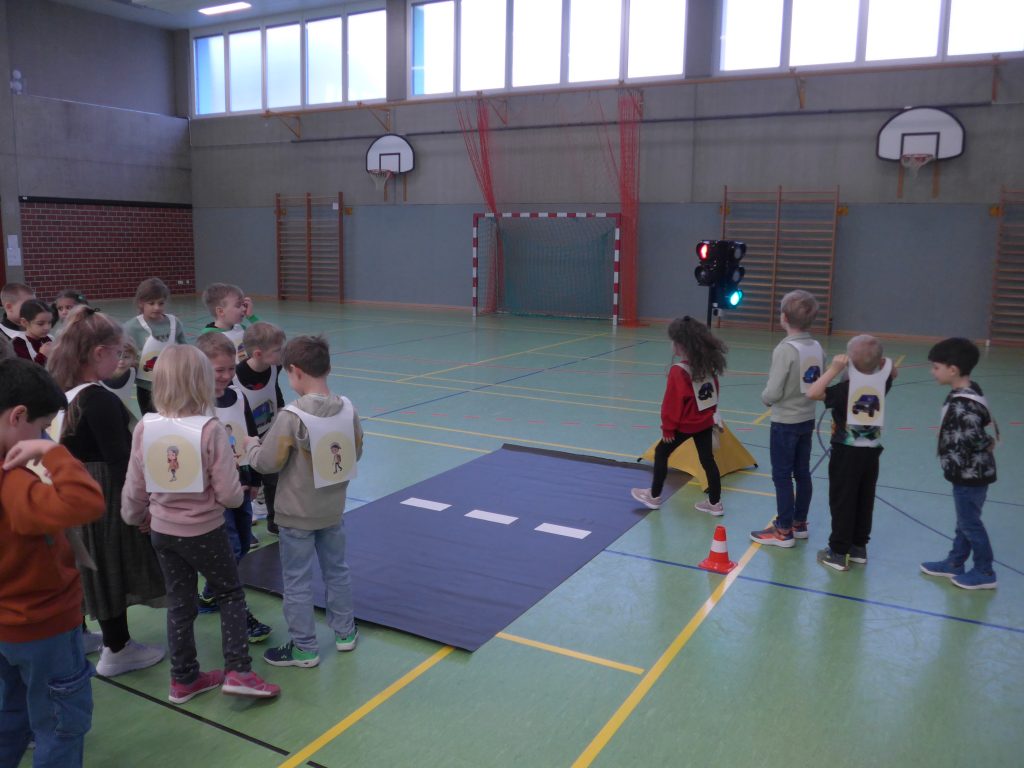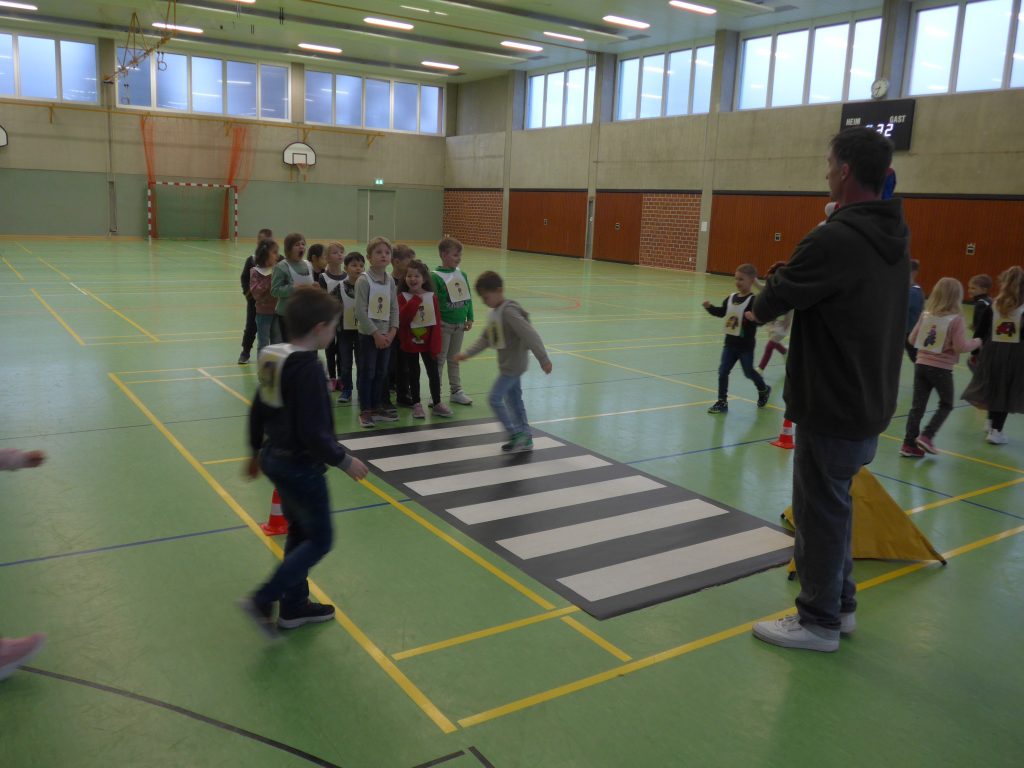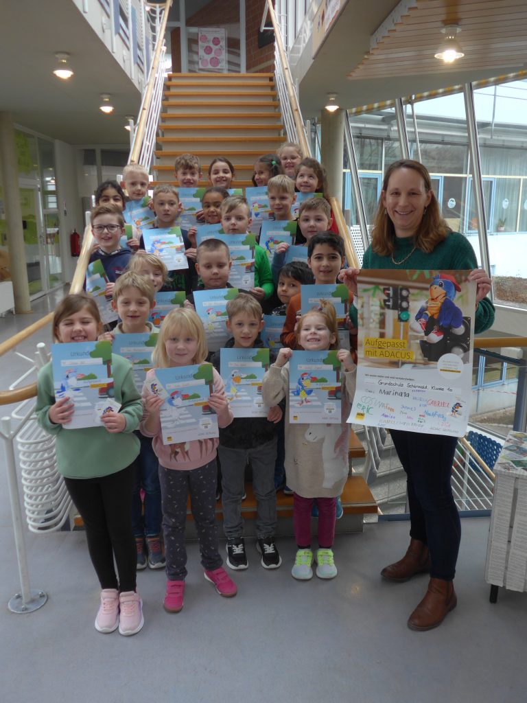 Vor allem für die ganz Kleinen ist es im Straßenverkehr sehr gefährlich. Um die Themen, die bereits zu Schulbeginn bei der Schulwegbegehung mit der Polizei besprochen und eingeübt wurden, zu vertiefen, hat die Klasse 1a am Projekt ADACUS teilgenommen. Der lustige blaue Vogel erklärte den Kindern auf anschauliche Weise das richtige Verhalten am Zebrastreifen und der Ampel. In der Turnhalle wurde dann fleißig trainiert. Alle bekamen eine Urkunde.