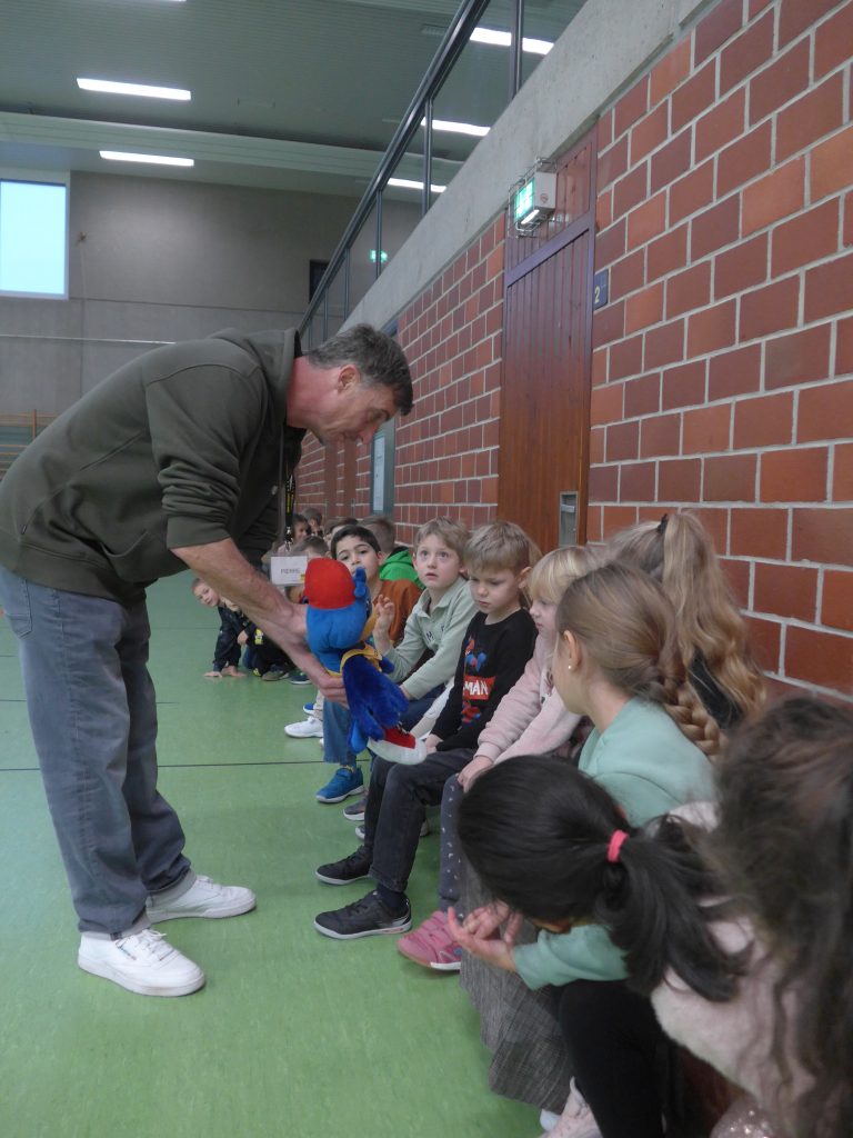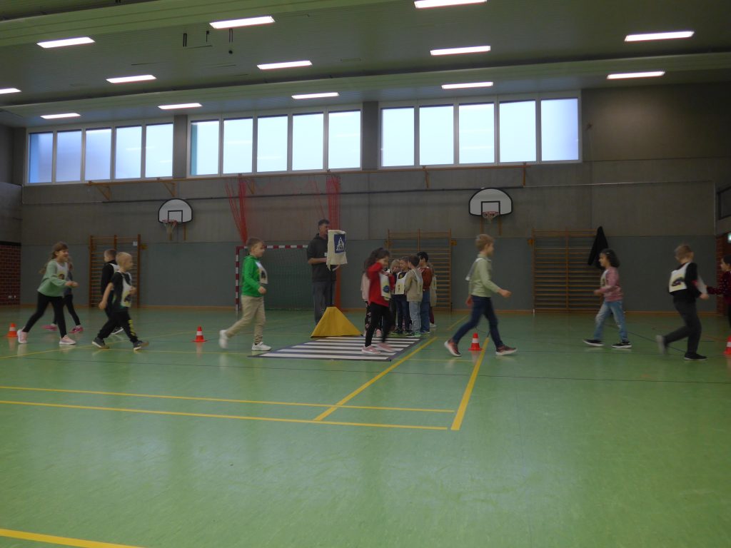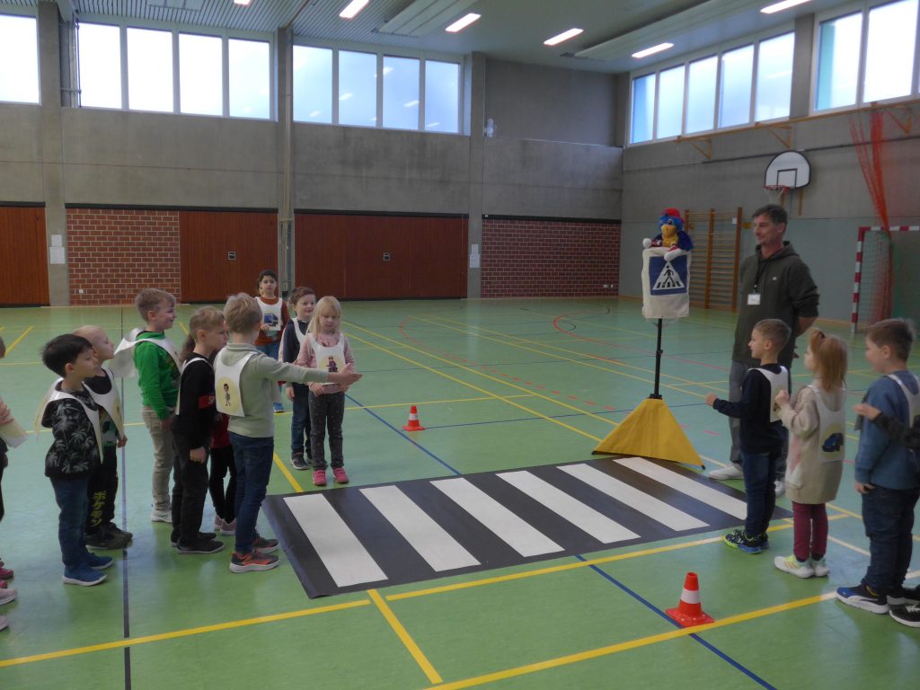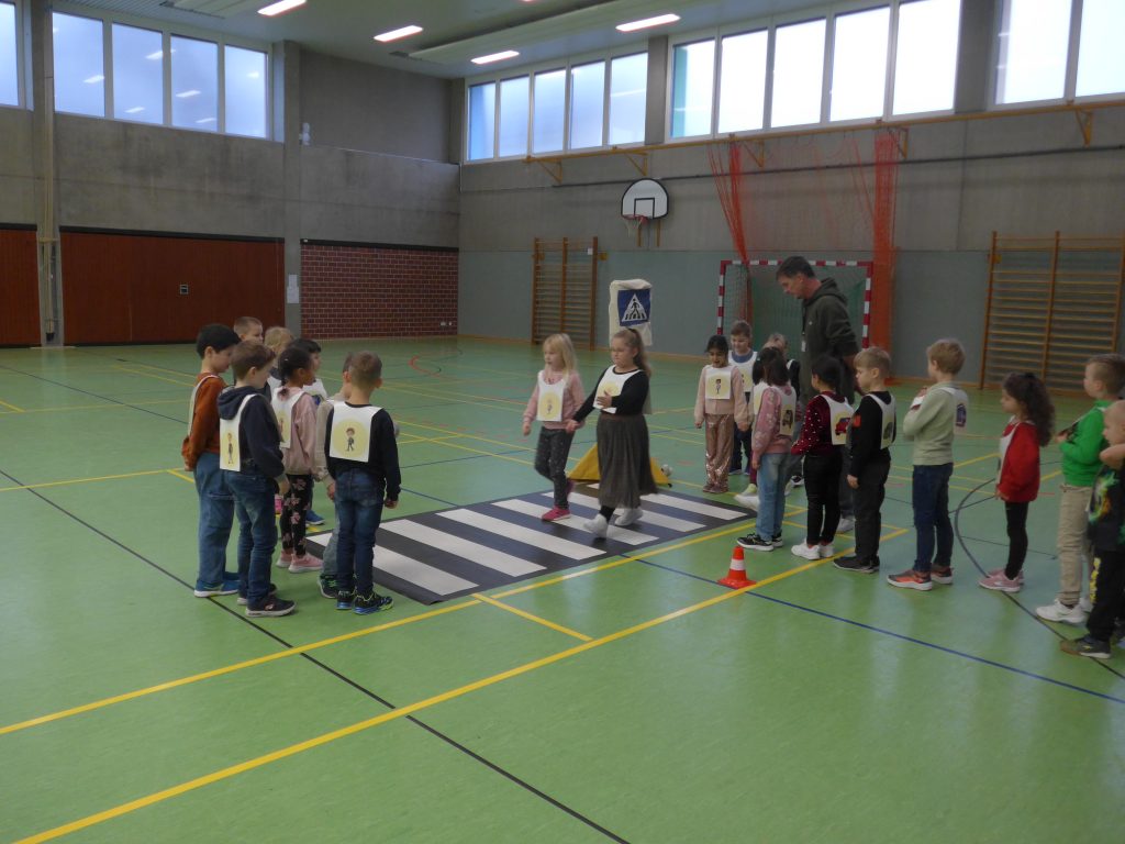 Vor allem für die ganz Kleinen ist es im Straßenverkehr sehr gefährlich. Um die Themen, die bereits zu Schulbeginn bei der Schulwegbegehung mit der Polizei besprochen und eingeübt wurden, zu vertiefen, hat die Klasse 1a am Projekt ADACUS teilgenommen. Der lustige blaue Vogel erklärte den Kindern auf anschauliche Weise das richtige Verhalten am Zebrastreifen und der Ampel. In der Turnhalle wurde dann fleißig trainiert. Alle bekamen eine Urkunde.