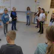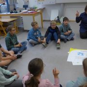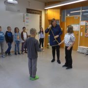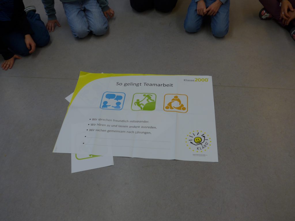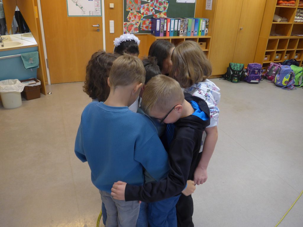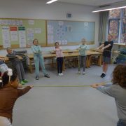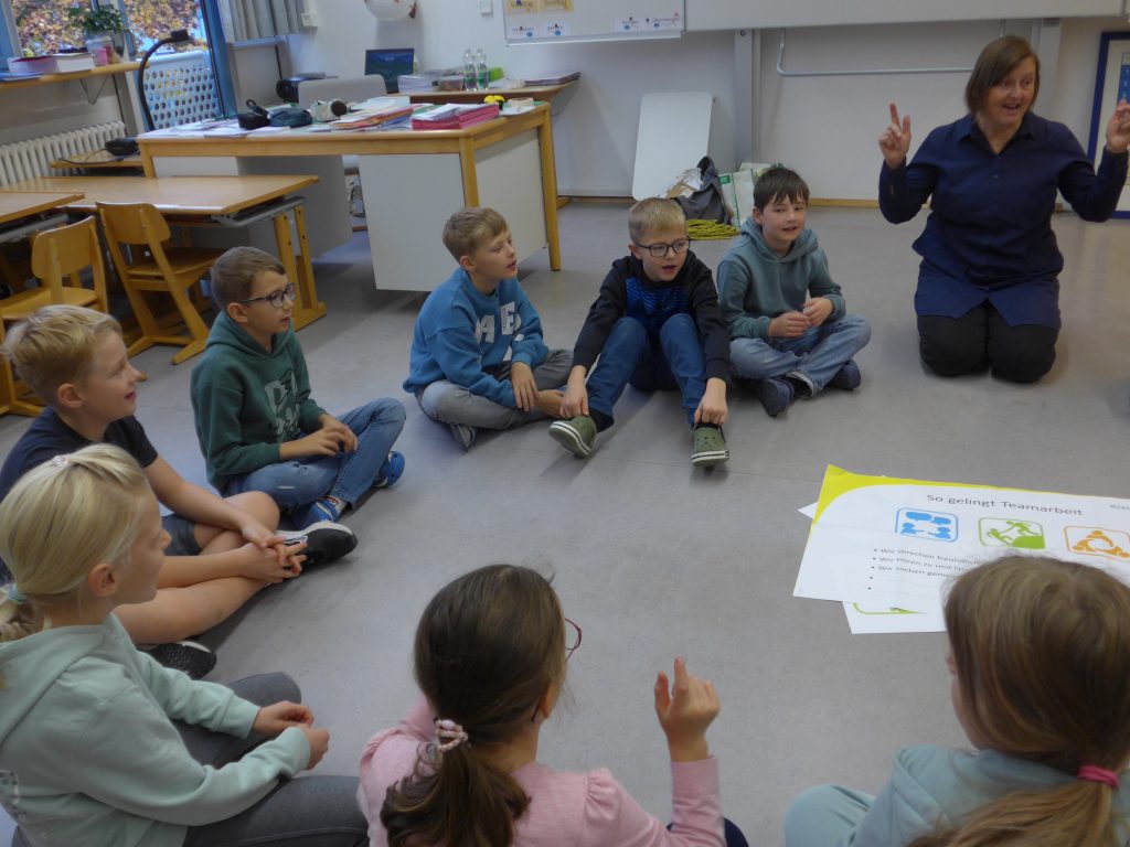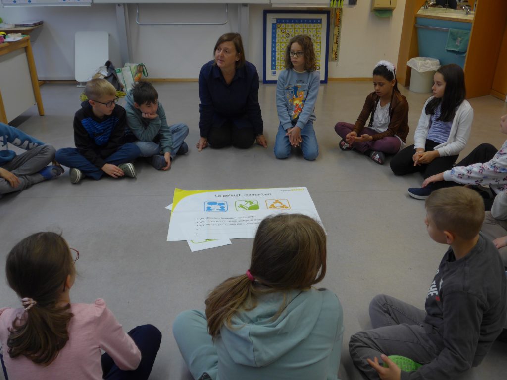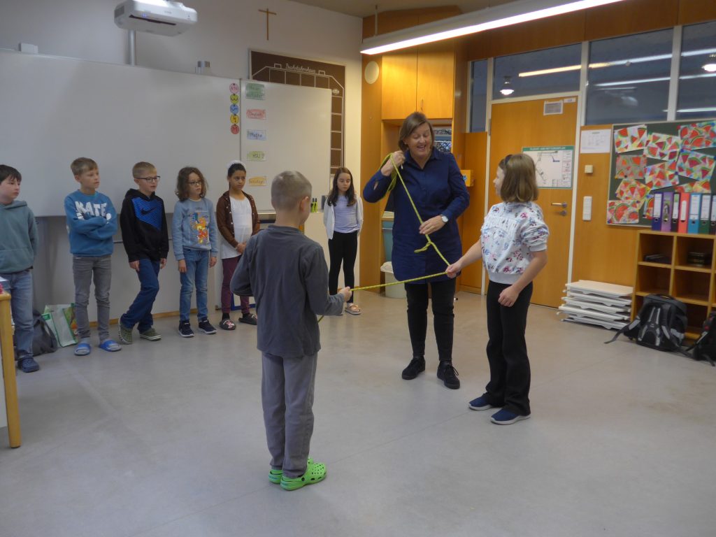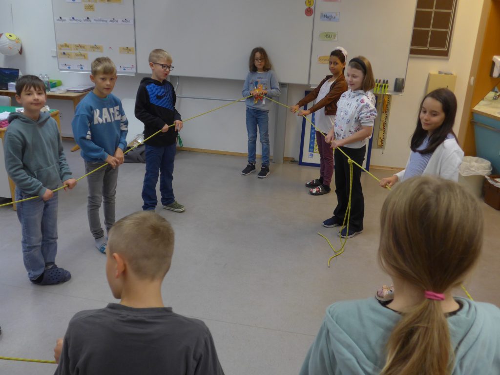 In den beiden 3. Klassen kam Gesundheitsförderin Astrid Eller hielt eine Stunde zum Thema Teamarbeit. Denn auch die psychische Gesundheit ist ein wichtiges Thema. „Zusammen geht es besser“, das stellten alle Schüler schnell fest. Man muss miteinander kommunizieren, sich gegenseitig helfen, zuhören, Rücksicht nehmen. Dies wurde eindrucksvoll und sicherlich nachhaltig in Form von Übungen mit einem Seil veranschaulicht. Alle mussten im wahrsten Sinne des Wortes „an einem Strang ziehen“, damit niemand verloren geht.