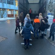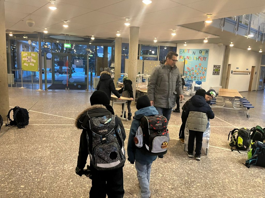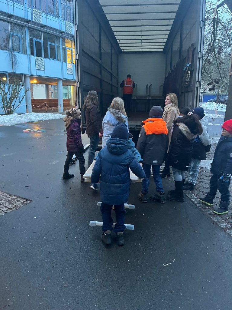 Der Lieferant hielt sich nicht an die vereinbarte Lieferzeit, so dass der Hausmeister prompt gerade beim Schülertransport mit dem Schulbus beschäftigt war. Aber die Kinder ließen sich von Frau Reitmeier nicht lange betteln. Alle packten früh um 7 Uhr mit an und schleppten die Tische und Stühle. Schnell war der gesamte LKW entladen.