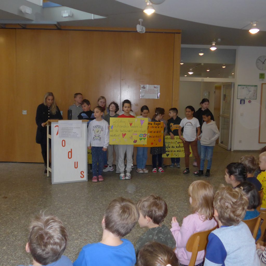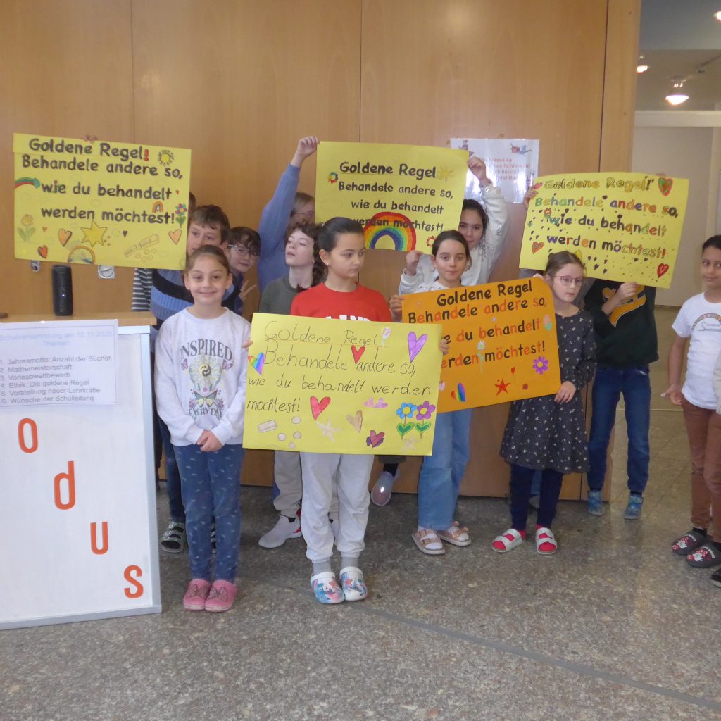 Danach stellten die Ehtikkinder ein Projekt vor, das sie mit ihrer Lehrerin Frau Pausch im Ethikunterricht erarbeitet haben. Die goldene Regel nach Immanuel Kant wurde von Batu, Sophia und Almina in einer beeindruckende Rede vorgestellt. Alle Ethikkinder haben dazu Plakate erstellt, die den Klassen geschenkt und im Anschluss an die Versammlung in den Klassenzimmern aufgehängt wurden. „Behandle andere so, wie du behandelt werden möchtest!“ An diese Regel wollen sich alle halten und sich immer wieder daran erinnern. Als Zeichen für die goldene Regel bekam jedes Schulkind von Frau Reitmeier ein goldenes Armband geschenkt.