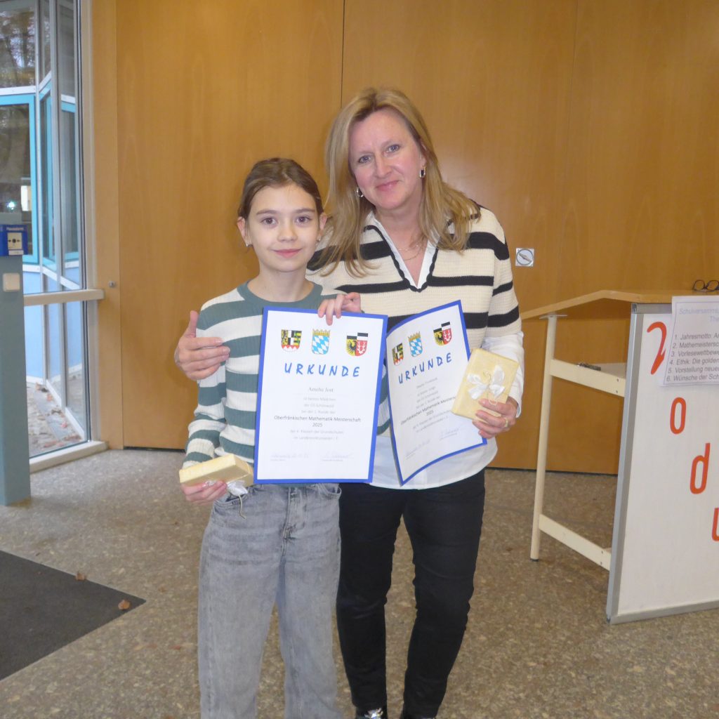 Anschließend wurden die Sieger der 4. Klasse bei der Mathemeisterschaft geehrt. Amelie und Dyma haben die meisten Punkte bei diesem Test erreicht und bekamen eine Urkunde und ein Knobelspiel geschenkt. Dyma geht nun in die landkreisweite 2. Runde nach Röslau. Wir wünschen ihm dafür viel Erfolg!